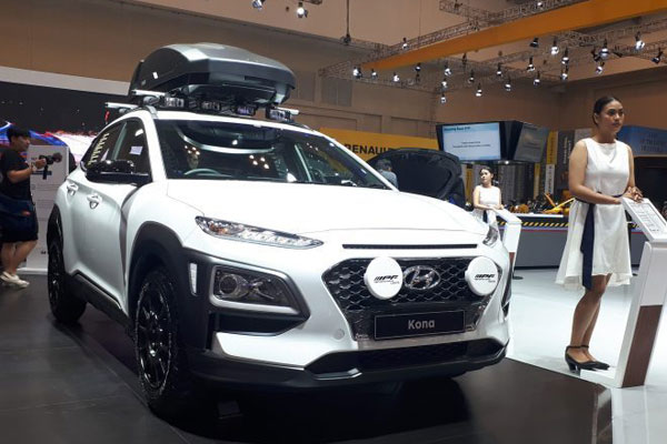 Salah satu mobil yang menyita perhatian di Booth Hyundai adalah Hyundai Kona berwarna putih. Mobil itu didandani ala kendaraan off-road. Adapun perubahannya dari versi standar antara lain, velg, ban, dan front seat.
