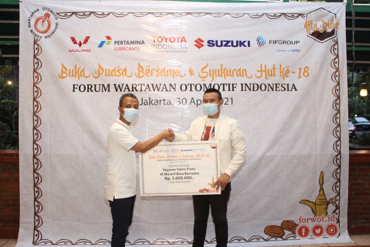 Kali ini, aksi sosial FORWOT bersama Wuling Motors, Pertamina Lubricants, Toyota Motor Manufacturing Indonesia (TMMIN), Suzuki dan FIFGROUP dilakukan lewat pemberian donasi kepada 3 lembaga nirlaba yakni Baitul Maal Hidayatullah (BMH), Aksi Cepat Tanggap (ACT), dan Yayasan Yatim Piatu Al Ma’arif Bina Bersama Cilandak Timur.