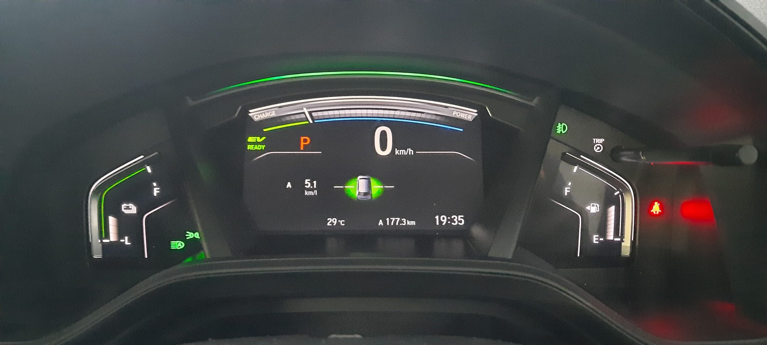 Di kecepatan rendah, yang bekerja hanyalah motor listriknya saja. Tapi jika kita sudah masuk ke kecepatan menengah, barulah sistem hybrid-nya bekerja. Indikator mesin yang menyala bisa dilihat dari adanya pergerakan grafik tenaga di bagian atas instrument cluster.