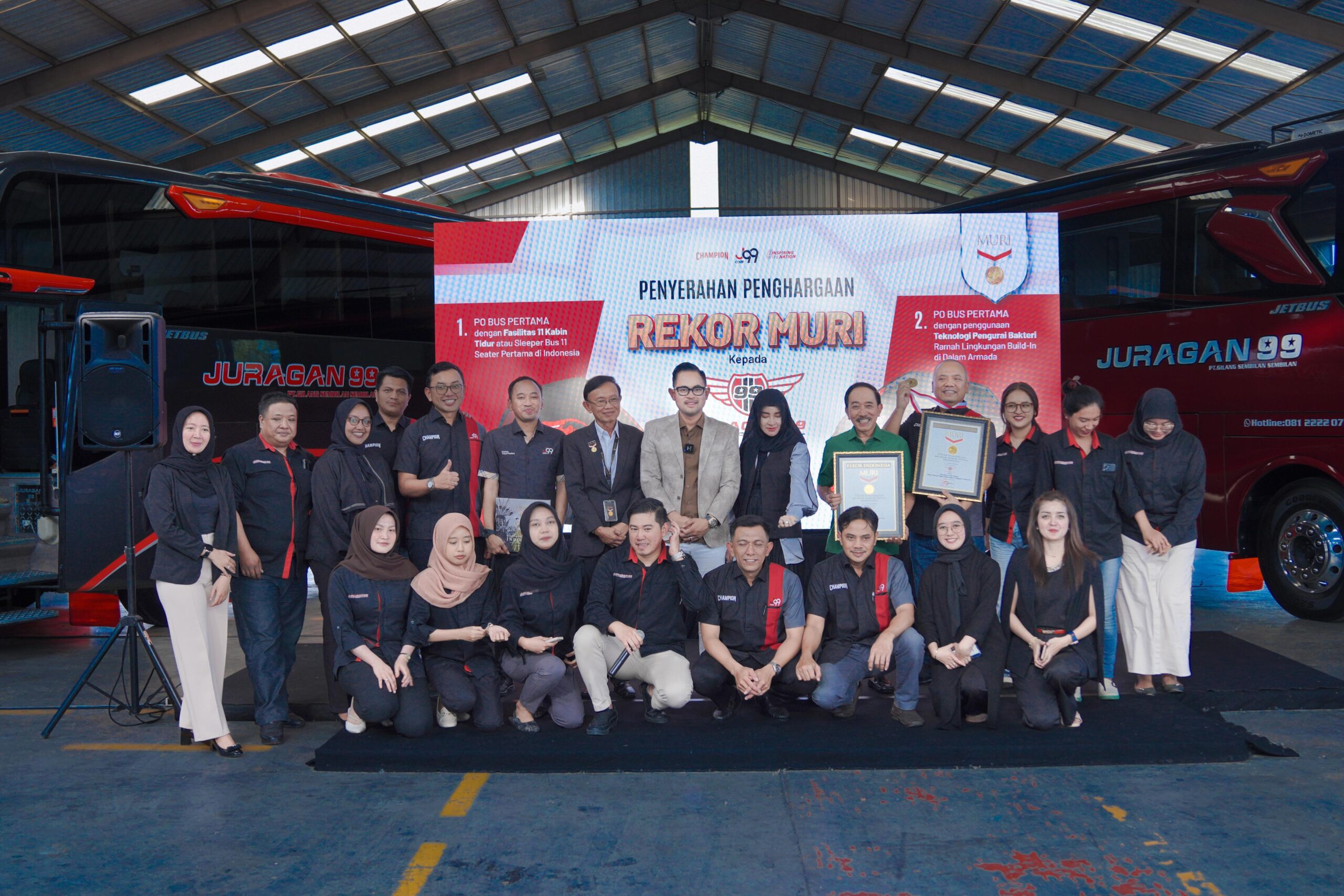 GARDUOTO – Pada Selasa (9/7/2024) lalu, PO Juragan 99 meraih dua rekor Museum Rekor Dunia Indonesia (MURI), yaitu PO Bus Pertama dengan Fasilitas 11 Kabin Tidur atau Sleeper Bus 11 Seater Pertama di Indonesia.